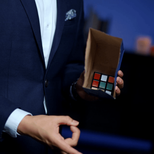 Your spectator FREELY mixes up a Cube, then places it into a simple, FLAT paper bag. They can even look inside to confirm the bag contains nothing but their mixed-up cube.